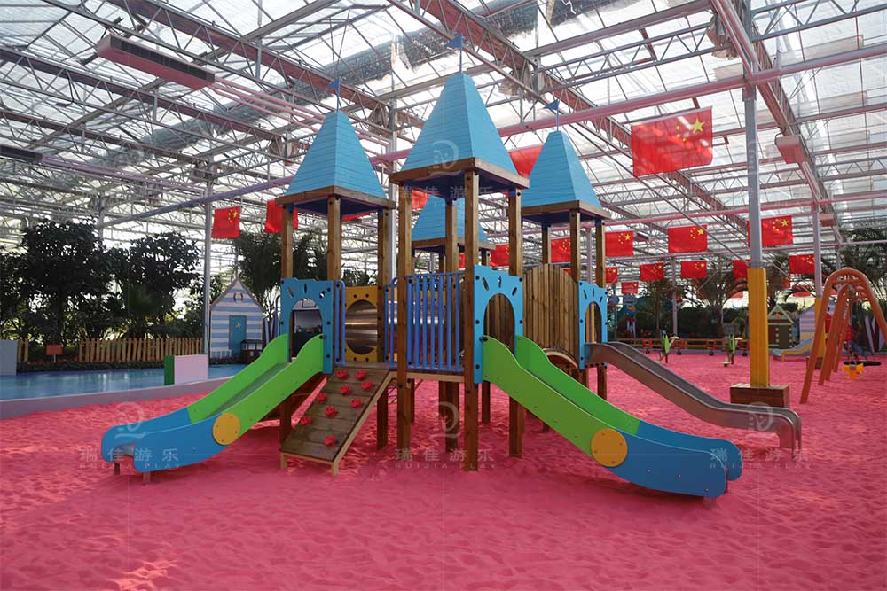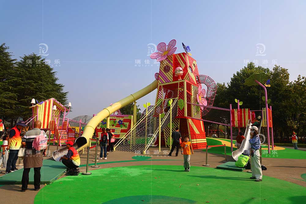 无动力“奇幻樱桃岛”属于高塔滑梯组合区是集趣味、运动与观赏于一体的大型户外游乐设施,它以其独特的樱桃造型成为园区内地标性的存在。在以安全为前提的情况下,为了增加奇幻樱桃岛的趣味性,无动力樱桃主设备上共设有滑梯、攀爬拓展、螺旋爬网、秋千、坡面攀爬等多种游玩设施,其中滑梯共有3个,分别包含板滑和桶滑,高度各不相同,适合全龄朋友游玩。